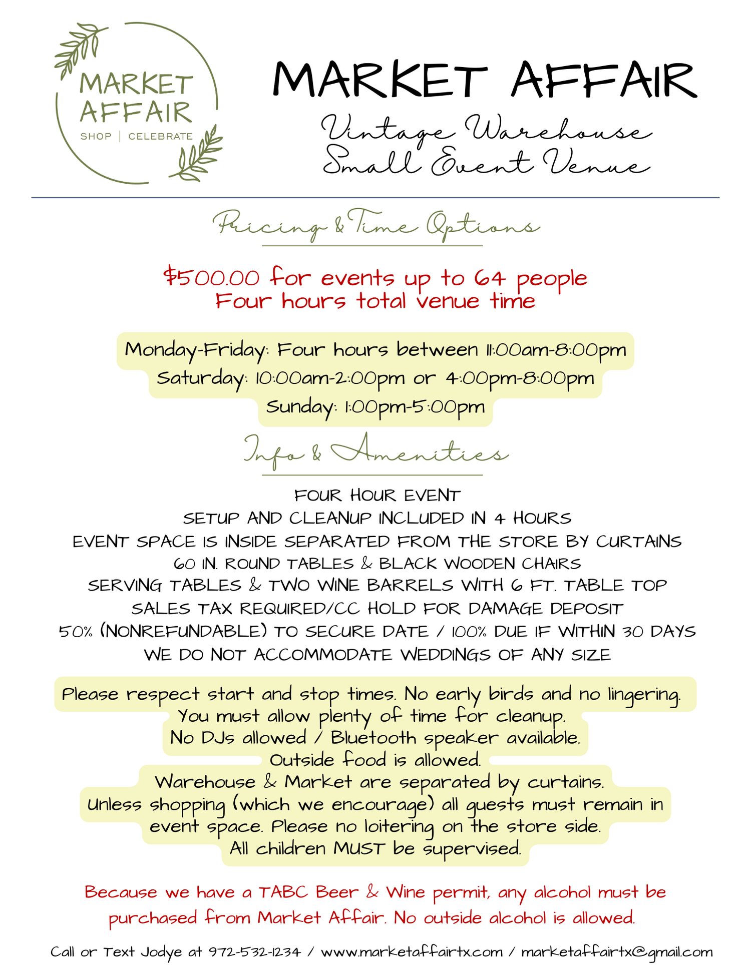 Because Market Affair has a TABC Beer & Wine permit, any beer and wine must be purchased directly from them and is limited to beer, wine, and seltzers. NO liquor is allowed on the premises. Since our permit is for on-premise consumption only, NO alcohol may leave the building, so do not buy more than you can drink. No alcohol may be consumed outside the Market Affair building or patio. Depending on the number of guests, a bartender may be required at the host's expense. Bringing in any outside alcohol may result in eviction from the building.